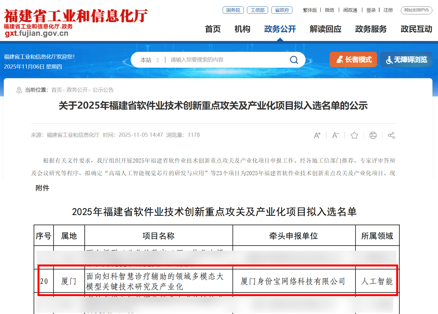 N E W S 日前,福建省工业和信息化厅公示“2025年福建省软件业技术创新重点攻关及产业化项目拟入选名单”。经过严格的专家评审答辩、会议研究等环节,身份宝“面向妇科智慧诊疗辅助的领域多模态大模型关键技术研究及产业化”项目成功入选! 背 景 近年来,国家、省、市发布多项政策推动“人工智能+”发展,聚焦医疗等重点领域垂直模型攻关与应用。卫健委等多个部门发布官方人工智能参考指引,推动医疗资源向基层下沉。作为医疗领域的重要组成部分,妇科感染患病率高、危害大,传统人工镜检诊疗耗时耗力,存在误诊率高、个性化诊疗不足等问题。 身份宝“面向妇科智慧诊疗辅助的领域多模态大模型关键技术研究及产业化”(以下简称“项目”)依托全国性妇产疾病研究资源和高校多模态大模型技术研究,重点攻关医学数据标注难、模型训练成本高、部署应用要求高等技术难点,打造面向妇科的大模型标注及垂类行业模型。 四大技术瓶颈 交互式高效医学数据标记 针对医学数据标注过程中样本少、标注难、人机交互体验差等问题,项目引入低开销大模型训练技术,打造交互式标注系统,实现人机协同,不仅可完成医学数据的高效标记,更可大幅减少人力成本。 多模态大模型高效迁移学习 针对医学特定场景任务数据多样、稀疏,模型定制化训练成本高等难题,项目基于多模态大模型的高效迁移学习技术,突破性提升模型泛化能力,提高模型在医学特定场景下的适应性,显著降低定制化训练成本。参数规模与性能已达国际领先水平。 低算力条件的多模态大模型压缩部署与国产化软硬件适配 在实时性高且边端算力受限的场景下,该技术通过模型减枝与轻量化、跨域知识迁移与自适应学习,提升模型运行效率,实现国产化软硬件适配,并可显著提升模型在低算力条件下的性能。 妇科感染辅助诊疗应用一体机 设备集病例分析、单图智能分析、自动诊断建议及报告生成于一体,支持多种感染精准分型,具备秒级自动生成诊断分析结果的能力,适配国产化信创环境,提升妇科感染诊疗的效率与准确性。