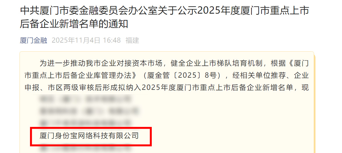 日前,厦门市地方金融管理局发布“2025年度厦门市重点上市后备企业”名单,身份宝凭借在技术创新、市场潜力等方面的突出表现,成功入选! 为了更好培育符合国家产业政策、具有高成长性和强劲竞争力的重点上市后备企业,相关部门制定了一系列严格标准。身份宝的成功入选彰显了其强劲的成长潜力与广阔的发展前景。 1 深耕数据应用场景,场景驱动技术应用 身份宝多年深耕基于人工智能及数据技术的应用场景开发与运营。公司以多场景的可信身份认证为基础、以高质量数据集与大模型垂类应用为新增长极,持续拓展业务至70+城市,覆盖公共安全、智慧社区、文旅康养等30余类数据与模型应用场景的落地。 面对大模型技术变革带来的产业机遇,身份宝将多年场景落地积累的数据技术及行业经验,集成研发了数据资源管理、多模态数据集服务以及大模型知识库等平台,为各行业提供高质量数据集以及大模型应用的专业化服务,已在运营商、大型制造业、商贸流通、医疗健康等行业企业实现新技术、新产品的落地应用。 2 打造典型示范案例,标准与生态共建合作 身份宝已成功打造了一批典型的数据和人工智能领域的示范场景和产品,如“厦鹭家政”、“农业高质量数据集”、“多模态身份识别”等场景和产品,获得福建省公共数据优秀案例、省公共数据赋能产业发展示范场景、省人工智能软件优质产品以及入选全国公共数据运营优秀案例。同时,积极参与国家行业标准的制定与跨区域的生态合作构建,获得国家数据局高质量数据集标准/技术文件验证试点典型单位,参与城市数据运营共同体(CDOU)场景小组的建设,推动跨区域的数据开发利用场景的拓展与落地。身份宝已拥有18项国家专利、近160项软件著作权并获得超90项荣誉资质,并累计参与了6项国家标准、公安部标准及地方标准的制定,建立品牌特色的技术护城河。 3 政策引领,加速“数据要素X”、“人工智能+”场景落地 近日,国务院办公厅发布《关于加快场景培育和开放推动新场景大规模应用的实施意见》,场景是连接技术和产业、打通研发和市场的桥梁,是推动科技创新和产业创新融合发展的重要载体。身份宝正持续以市场化应用场景建设为抓手,联合清华大学、厦门大学等顶尖的人工智能研究团队,开展新技术、新产品、新业态产业化应用验证,进一步巩固在数据技术与人工智能应用领域的领先地位。 此次入选重点上市后备企业,将为身份宝提供更广阔的发展平台。公司将继续深化“场景驱动技术变革”战略,为各行业数字化、智能化转型提供坚实支撑,引领数据技术与人工智能应用发展新阶段。